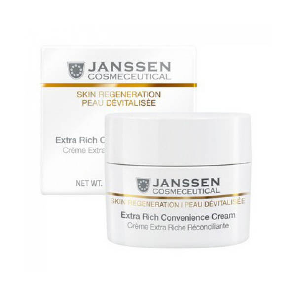 Janssen Skin Regeneration Anti-Age Extra Rich Convenience Cream Экстраобогащенный питательный крем: это крем насыщенной текстуры, не оставляющий жирного блеска на коже. Восстанавливает защитный липидный барьер и укрепляет дерму изнутри, способствует восстановлению естественного гидролипидного баланса зрелой кожи, повышает ее упругость и эластичность, смягчает. Надежно защищает чувствительную кожу в зимний период. При регулярном использовании кожа выглядит отдохнувшей, гладкой, с запасом жизненной энергии.